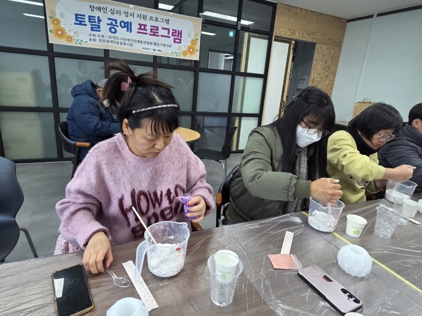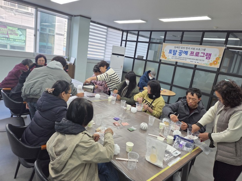 이용자 프로그램 토탈공예 10회기 작성자 정보 전주시장애인단체총연합회 작성 작성일 2025.11.20 17:24 컨텐츠 정보 2 조회 목록 답글 본문 이번 시간에는 규조토 화병만들기를 하였습니다 비이커 같은 통에 가루를 넣고 색을 넣어서 저어보았습니다. 화병모양을 만들고 마르는 시간이 필요해서 센터에 놓고 다음주에 갖가지고 하고 마쳤습니다 관련자료 댓글 0 등록된 댓글이 없습니다. Select File Upload File 목록 답글
