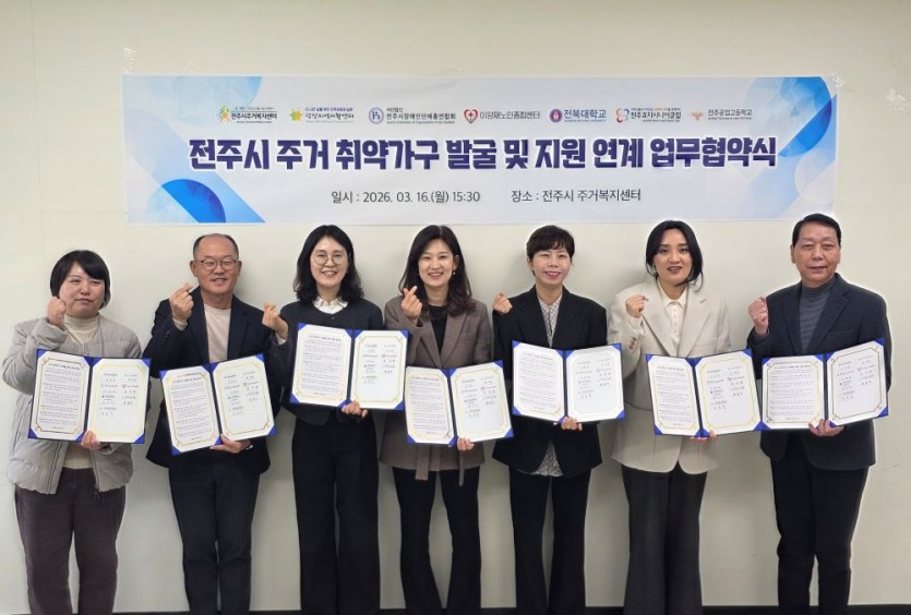 전주시 주거 취약가구 발굴 및 지원 연계 업무협약식 작성자 정보 전주시장애인단체총연합회 작성 작성일 2026.03.18 09:15 컨텐츠 정보 24 조회 목록 본문 전주시 주거 취약가구 발굴 및 지원 연계 업무협약은 주거 문제를 겪고 있는 취약계층을 선제적으로 발굴하고 촘촘한 주거 서비스 연계 체계를 구축하기 위해 마련됐으며 협약에는 전주시장애인단체총연합회,덕진지역자활센터, 이양재노인종합센터, 전주효자시니어클럽, 전북대학교 주거환경학과, 전주공업고등학교, 전주시 주거복지센터 등 7개 기관·단체가 참여했습니다. 관련자료 댓글 0 등록된 댓글이 없습니다. 로그인한 회원만 댓글 등록이 가능합니다. 목록